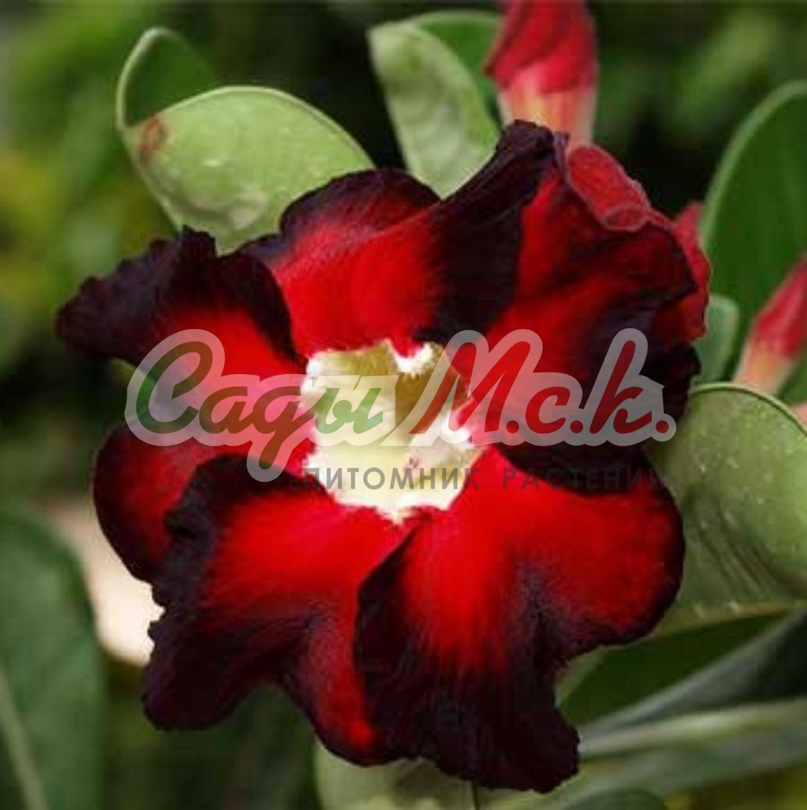 Adenium Flame Angel - куст компактный, раскидистый. Листья оригинальные, крупные, зеленые. Сорт отличается большими, роскошными, махровыми (в 2, 3 и даже 4 ряда лепестков, подобно пышной розе), насыщенно-алыми цветками с тонкой темной каемкой по краям лепестков. Цветение обильное и длительное - с ранней весны до глубокой осени.